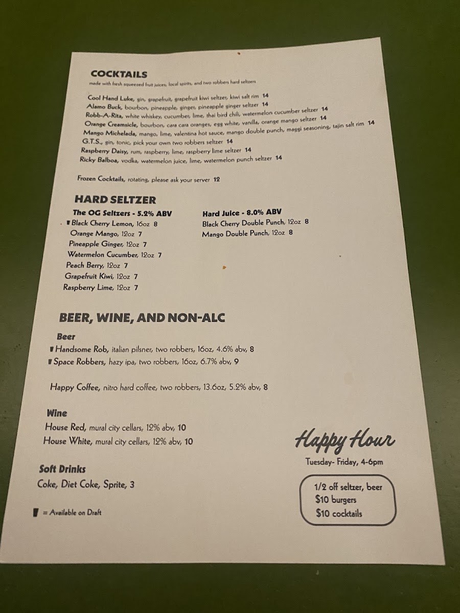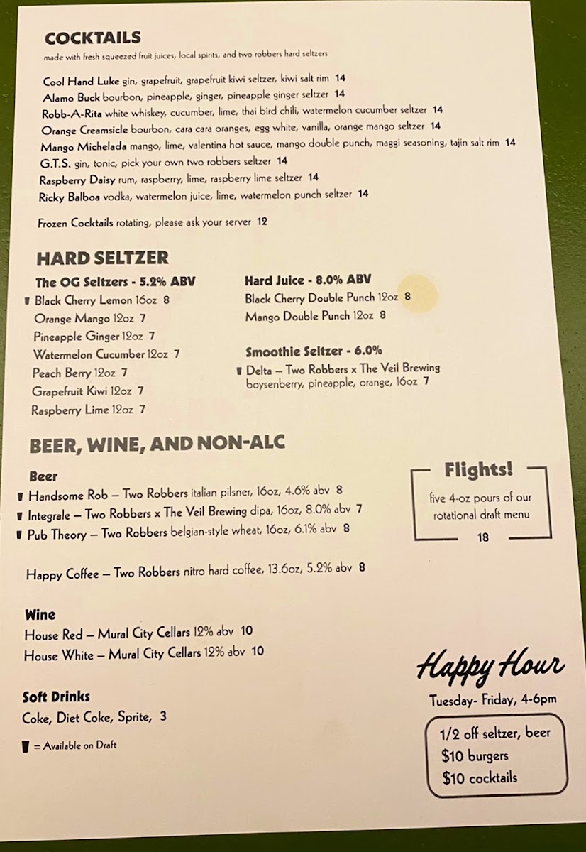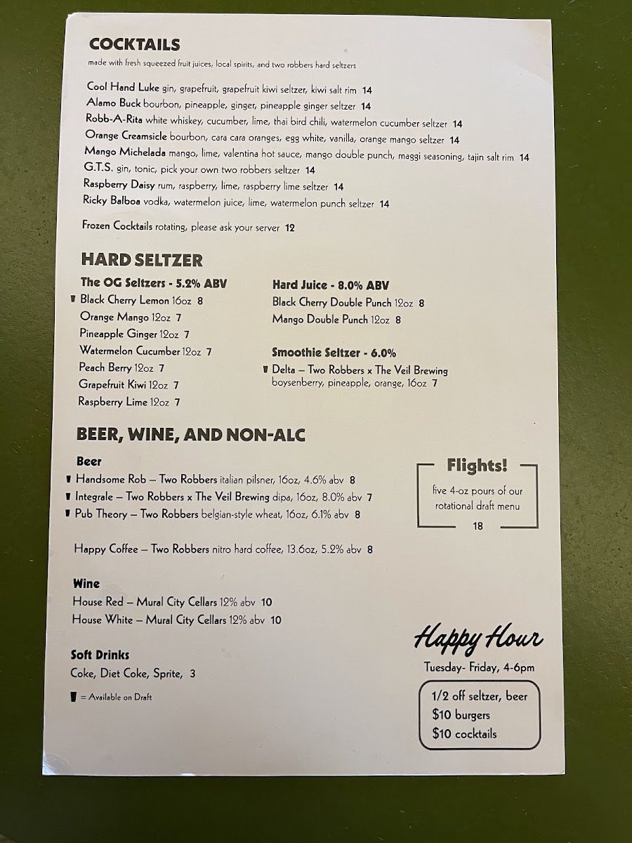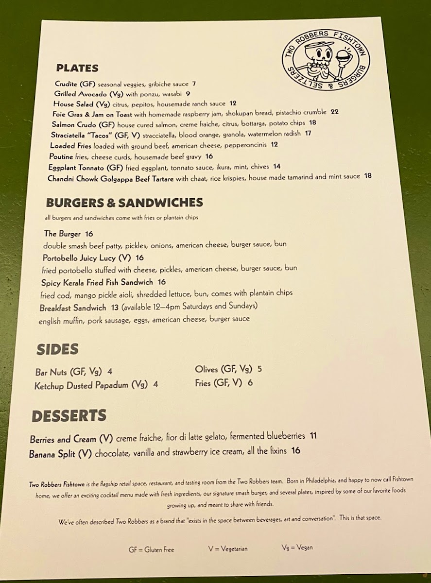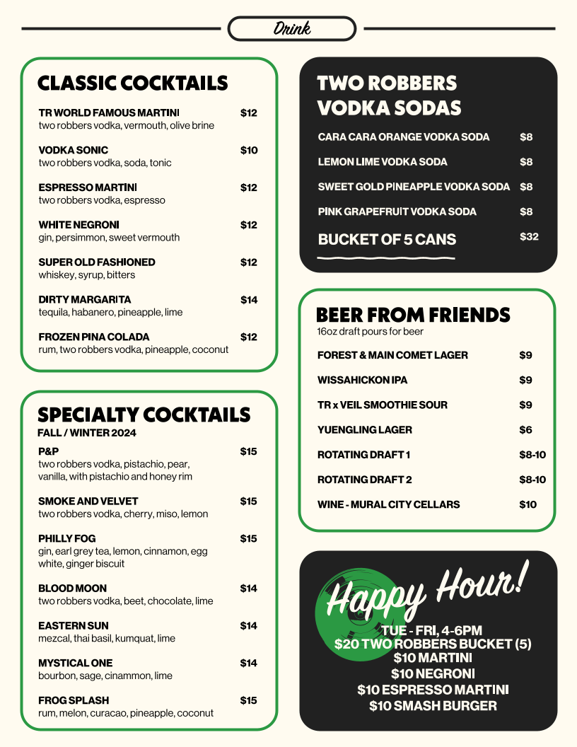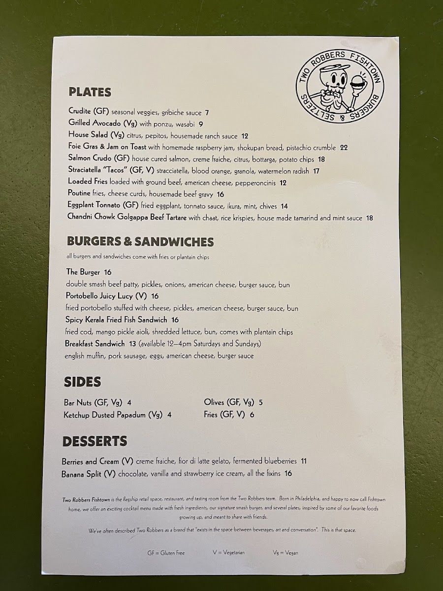 The menu at Two Robbers Fishtown offers a laid-back selection of casual bites and thoughtfully crafted drinks, perfect for relaxed afternoons or lively evenings. Here, you’ll find comforting favorites like the Two Robbers Smash Burger and Chicken Sandwich alongside inventive cocktails such as the Pineapple Ginger Buck and Spicy Margarita, crafting a balanced variety that suits both food and drink enthusiasts.